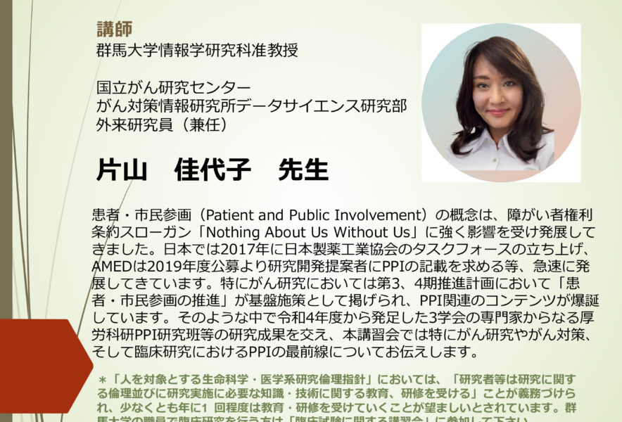 そのような中で令和4年度から発足した3学会の専門家からなる厚労科研PPI研究班等の研究成果を交え、本講習会では特にがん研究やがん対策、そして臨床研究におけるPPIの最前線についてお伝えします。